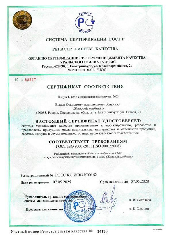 ГОСТ 1129-2013, стандартам ISO 22000, HACCP